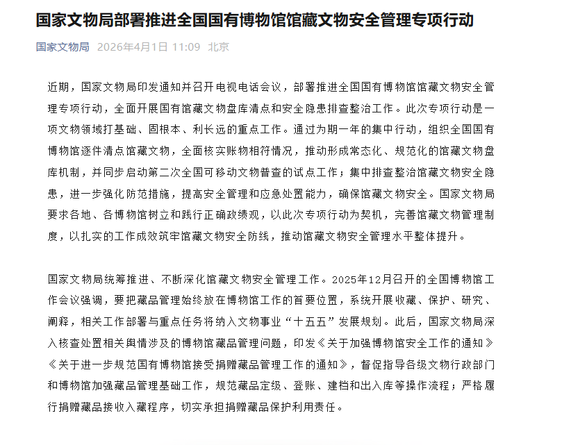 近期,国家文物局印发通知并召开电视电话会议,部署推进全国国有博物馆馆藏文物安全管理专项行动,全面开展国有馆藏文物盘库清点和安全隐患排查整治工作。此次专项行动是一项文物领域打基础、固根本、利长远的重点工作。通过为期一年的集中行动,组织全国国有博物馆逐件清点馆藏文物,全面核实账物相符情况,推动形成常态化、规范化的馆藏文物盘库机制,并同步启动第二次全国可移动文物普查的试点工作;集中排查整治馆藏文物安全隐患,进一步强化防范措施,提高安全管理和应急处置能力,确保馆藏文物安全。国家文物局要求各地、各博物馆树立和践行正确政绩观,以此次专项行动为契机,完善馆藏文物管理制度,以扎实的工作成效筑牢馆藏文物安全防线,推动馆藏文物安全管理水平整体提升。